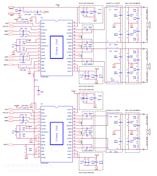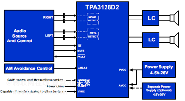 圖2. TPA3128D2簡(jiǎn)化應(yīng)用電路圖