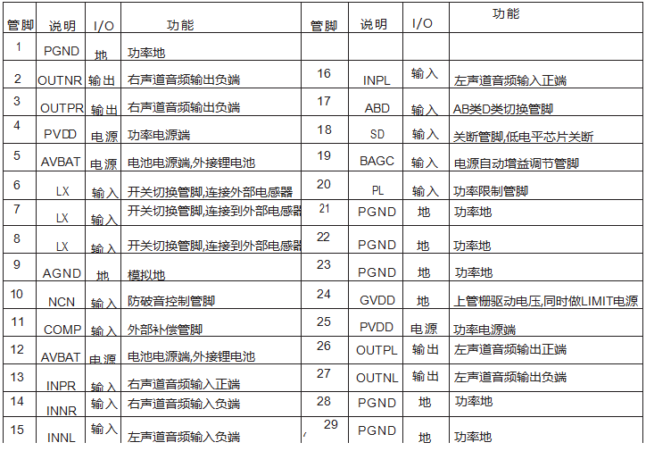 在音頻應(yīng)用中,輸入信號過大或者電池電壓下降等因素都會導(dǎo)致音頻功放的輸出信號發(fā)生破音失真,而且過載的信號會對揚聲器造成永久性損傷。CS8359C獨特的無破音(NCN)功能可以通過檢測放大器輸出信號的破音失真,自動調(diào)整系統(tǒng)增益,使得輸出音頻信號保持圓潤平滑,不僅有效地避免了大功率過載輸出對喇叭的損 壞,同時帶來更舒 適的聽覺享受。CS8359C提供四種NCN工作模式和不防破音模式可供用戶選擇 :M1,M2,M3,M4,NCNOFF,可以通過設(shè)置NCN引腳的不同狀態(tài)來分別進(jìn)入五種模式。啟動時間(Attack Time): 從發(fā)生破音失真到系統(tǒng)自動增益調(diào)節(jié)完成的時間間隔。釋放時間(Release Time):從破音失真消失到系統(tǒng)完全退出增益衰減狀態(tài)的時間間隔。通過NCN管腳狀態(tài)設(shè)置M1,M2,M3,M4,NCNOFF模式的啟動時間和釋放時間如下表所示。