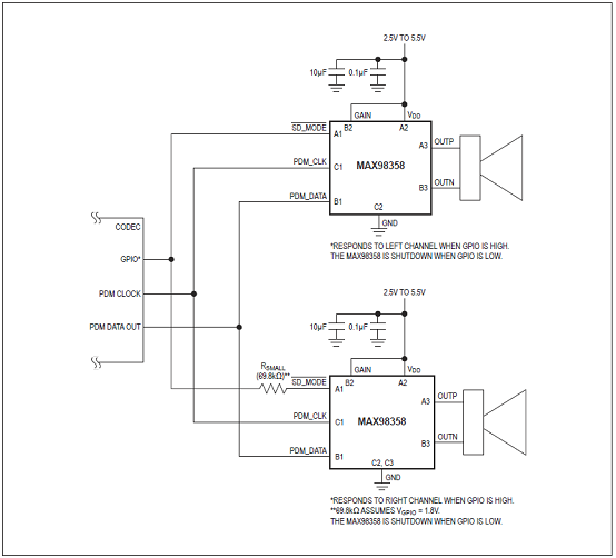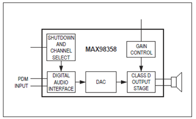 The MAX98358 is a digital pulse-density modulated (PDM) input Class D power amplifier that provides Class AB audio performance with Class D efficiency. This IC offers five selectable gain settings (3dB, 6dB, 9dB, 12dB, and 15dB) set by a single gain-select input (GAIN). The IC can be configured to produce a left channel, right channel,or (left/2 + right/2) output from the stereo input data.