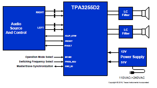 TPA3255 是一款高性能 D 類功率放大器,它具有 D 類效率并且能夠帶來真正的高端音質(zhì)。該器件 特有 高級(jí)集成反饋設(shè)計(jì)和專有高速柵極驅(qū)動(dòng)器錯(cuò)誤校正功能(PurePath™ 超高清)。該技術(shù)可使器件在整個(gè)音頻頻帶內(nèi)保持超低失真,同時(shí)展現(xiàn)完美音質(zhì)。該器件在 AD 模式下工作,THD 為 10% 時(shí)最多可驅(qū)動(dòng) 2 個(gè) 315W/4Ω 負(fù)載和 2 個(gè) 150W(未削波功率)/8Ω 負(fù)載,并且 特有 一個(gè) 2 VRMS 模擬輸入接口,支持與高性能 DAC(例如 TI 的 PCM5242)無縫連接。除了出色的音頻性能外,TPA3255 還兼具高功率效率和超低功率級(jí)空閑損耗(低于 2.5W)兩大優(yōu)點(diǎn)。這可以通過 85mΩ MOSFET 以及優(yōu)化的柵極驅(qū)動(dòng)器方案來實(shí)現(xiàn)。該方案相對(duì)于傳統(tǒng)的分立實(shí)現(xiàn)方案可顯著降低空閑損耗。
