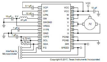 The DRV10983-Q1 device uses a proprietary sensorless control scheme to provide continuous sinusoidal drive,which significantly reduces the pure tone acoustics that typically occur as a result of commutation. The interfaceto the device is designed to be simple and flexible. The motor can be controlled directly through PWM, analog, orI2C inputs. Motor speed feedback is available through both the FG pin and the I2C interface simultaneously.
