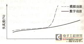 圖1 全數(shù)字功放與普通功放過載失真度比較