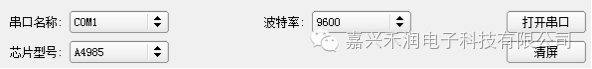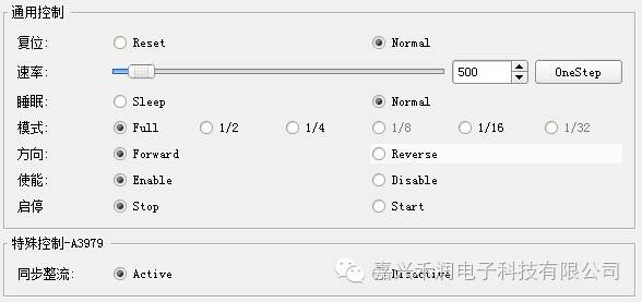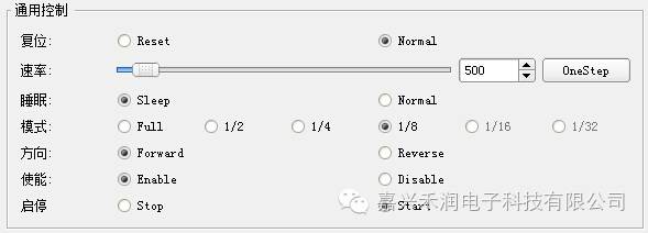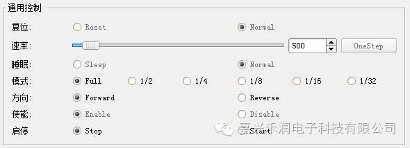在選擇好芯片型號后,就會在通用控制界面中顯示該芯片能進行操作的功能,上圖片為4985芯片的操作界面,主要功能分為復位、速率、睡眠、模式、方向、使能、啟停。