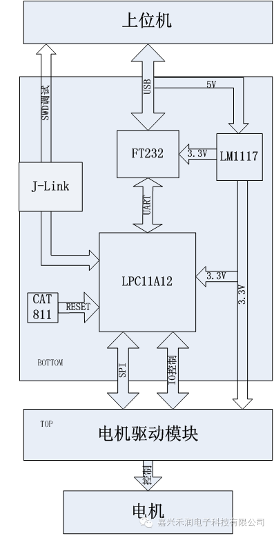 本文參考設計,硬件由兩部分組成,一部分為通用底座(BOTTOM),主要為通信部分,可兼容禾潤的多種電機驅動模塊;另一部分為采用了禾潤電子驅動控制芯片的驅動模塊(TOP)。另外,該參考設計還使用了電機驅動控制圖形用戶界面,能非常方便的調試相關電機模塊。