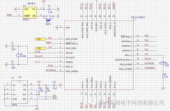 此部分包含單片機核心器件及外圍簡單電路,包括硬件按鈕復位、無源晶振和I2C存儲器件。