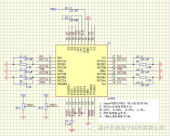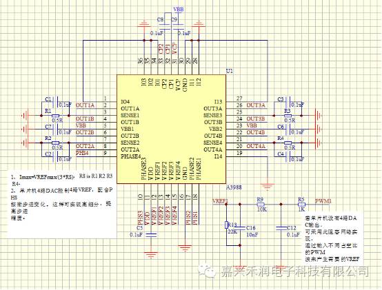 A3988的每路電機可獨立實現(xiàn)整步、1/2步、1/4步、1/8步、1/16步、1/32步步進模式控制。