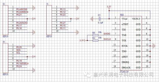 此部分為接口電路,包括三排排針,與上板電機驅動板通信,另一塊為JTAG接口,用于單片機程序調試。