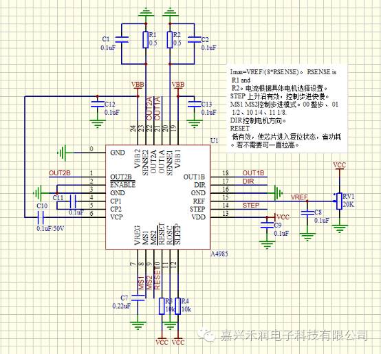 HR4985為最高1/8細分步進模式,可提供35V 1A的驅動輸出,控制一個雙極步進電機。STEP管腳上一個上升沿輸入,控制步進電機向前步進一個固定角度,這樣省去了外部單片機繁雜的邏輯控制。在步進操作期間,工作于混合衰減模式的電流調節(jié)器來降低電機運轉的噪聲,增加步進準確性。