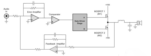 PWM信號(hào)進(jìn)行適當(dāng)?shù)碾娖阶儞Q,然后送到柵極驅(qū)動(dòng)器,這個(gè)驅(qū)動(dòng)器控制由MOSFET(M1和M2)組成的雙態(tài)功率電路。放大后的信號(hào)然后通過(guò)輸出濾波器(消除PWM載波頻率),最終僅僅放大了的模擬音頻信號(hào)驅(qū)動(dòng)揚(yáng)聲器。通過(guò)把濾波器輸入信號(hào)反饋到錯(cuò)誤放大器輸入端,進(jìn)行外部環(huán)路濾波,降低了失真和噪聲,進(jìn)一步提高了音頻輸出保真度。