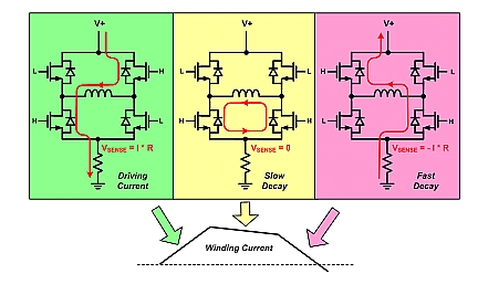 大多數(shù)的步進電機驅動IC,依靠步進電機繞組的電感特性實現(xiàn)PWM電流調節(jié)。通過每個繞組對應的功率MOSFET組成的H橋電路,隨著PWM控制開始,電源電壓被加到電機繞組上,從而產生驅動電流。一旦電流達到設定值,H橋就會切換控制狀態(tài),使得輸出電流衰減。 一定固定時間后,一個新的PWM周期又會開始,H橋再次產生線圈電流。