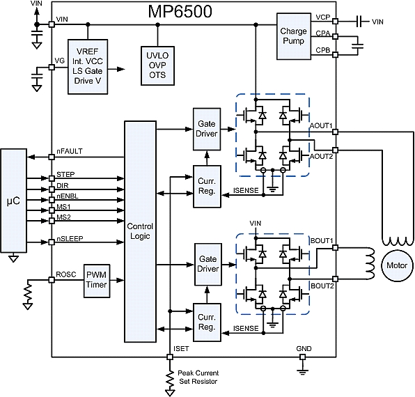 MP6500最大驅動電流峰值為2.5A(具體取決于封裝和PCB設計);電源電壓范圍從4.5V至35V。 支持整步,半步,四分之一步,八分之一步驅動模式。不需要外部電流檢測電阻,只需要一個接地的小型、低功耗電阻去設定繞組電流峰值。