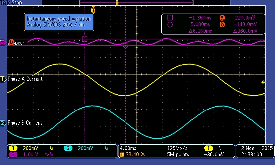 頻率電壓轉換器的輸出顯示電機瞬時速度的變化是周期性的,與驅動電流波形同步。這個速度變化很可能是由于電機本身的磁場和機械構造的缺陷引起的,也部分原因可能是編碼器,測試機架,或驅動電流的諧波失真分量。