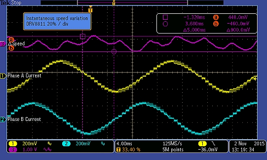 MPS MP6500步進驅動集成芯片,采用內部電流采樣和上述的自動衰減電流調節(jié)方案,可以實現(xiàn)更好的電機運行質量。如圖13所示,速度變化雖不是和模擬正弦和余弦波電流驅動的結果一樣小,但是比傳統(tǒng)的驅動方案要改善許多,使得電機運行更平穩(wěn)安靜,定位更精確。