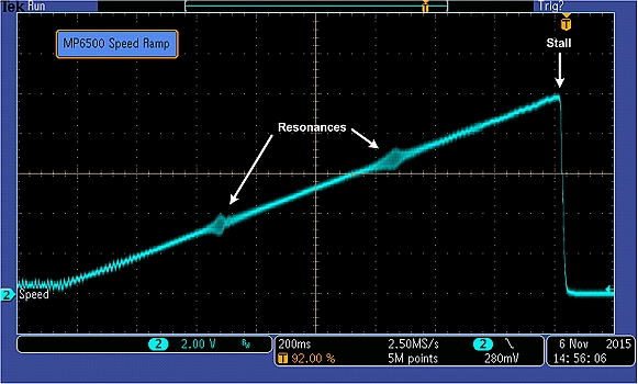 使用相同的設置和繞組電流,如圖15所示,由于更好的自適應電流調節(jié)控制方案,MP6500可以驅動明顯更高的速度。失速發(fā)生時,速度測量結果是在10V左右,相當于在600RPM。