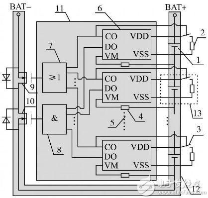 其中:1為單節(jié)鋰離子電池;2為充電過電壓分流放電支路電阻;3為分流放電支路控制用開關(guān)器件;4為過流檢測(cè)保護(hù)電阻;5為省略的鋰電池保護(hù)芯片及電路連接部分;6為單節(jié)鋰電池保護(hù)芯片(一般包括充電控制引腳CO,放電控制引腳DO,放電過電流及短路檢測(cè)引腳VM,電池正端VDD,電池負(fù)端VSS等);7為充電過電壓保護(hù)信號(hào)經(jīng)光耦隔離后形成并聯(lián)關(guān)系驅(qū)動(dòng)主電路中充電控制用MOS管柵極;8為放電欠電壓、過流、短路保護(hù)信號(hào)經(jīng)光耦隔離后形成串聯(lián)關(guān)系驅(qū)動(dòng)主電路中放電控制用MOS管柵極;9為充電控制開關(guān)器件;10為放電控制開關(guān)器件;11為控制電路;12為主電路;13為分流放電支路。單節(jié)鋰電池保護(hù)芯片數(shù)目依據(jù)鋰電池組電池?cái)?shù)目確定,串聯(lián)使用,分別對(duì)所對(duì)應(yīng)單節(jié)鋰電池的充放電、過流、短路狀態(tài)進(jìn)行保護(hù)。該系統(tǒng)在充電保護(hù)的同時(shí),通過保護(hù)芯片控制分流放電支路開關(guān)器件的通斷實(shí)現(xiàn)均衡充電,該方案有別于傳統(tǒng)的在充電器端實(shí)現(xiàn)均衡充電的做法,降低了鋰電池組充電器設(shè)計(jì)應(yīng)用的成本。