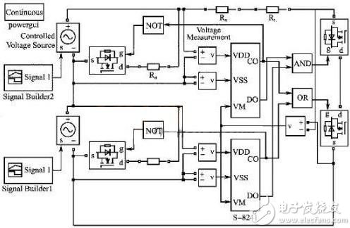 根據(jù)上述均衡充電保護(hù)板電路工作的基本原理,在Matlab/Simulink環(huán)境下搭建了系統(tǒng)仿真模型,模擬鋰電池組充放電過程中保護(hù)板工作的情況,驗(yàn)證該設(shè)計(jì)方案的可行性。為簡單起見,給出了鋰電池組僅由2節(jié)鋰電池串聯(lián)的仿真模型,如圖5所示。
