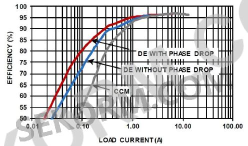 圖1 效率與負(fù)載曲線,兩相升壓,三種工作模式,fSW=200kHz,VIN=12V,V0UT=36V,TA=+25℃