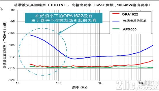 如上圖所示,傳統(tǒng)的運(yùn)放由于不對稱發(fā)熱引起的失真會體現(xiàn)在這部分低頻時(shí),就會有很大的THD+N的值。這部分對于真正愛好音頻和追求極致音質(zhì)的人來說這是絕對不能接受的,因?yàn)樗麜牭街C波一直發(fā)聲。OPA1622特別的設(shè)計(jì)使得兩個(gè)運(yùn)放在內(nèi)部就被設(shè)置好了,當(dāng)發(fā)熱時(shí)這個(gè)影響就會被消除掉。