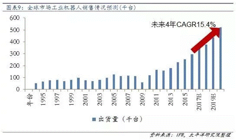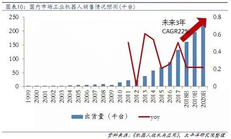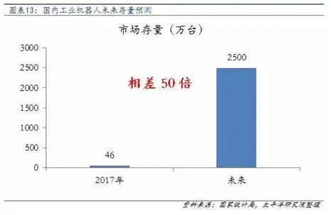 根據(jù)國(guó)家統(tǒng)計(jì)局的數(shù)據(jù),我國(guó)有5000萬(wàn)制造業(yè)職工,以每臺(tái)工業(yè)機(jī)器人替代2-3位工人來(lái)看,潛在存量市場(chǎng)會(huì)達(dá)到1800-2500萬(wàn)臺(tái),考慮到很多崗位還不能用機(jī)器人替代,可能實(shí)際市場(chǎng)并沒(méi)有這么大。我們與行業(yè)專家討論,五年內(nèi)可以看到國(guó)內(nèi)市場(chǎng)年銷量達(dá)到50-60萬(wàn)臺(tái)。