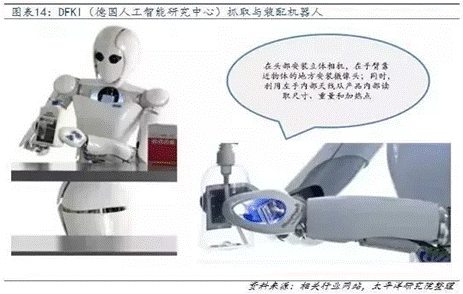 為了增加工業(yè)機(jī)器人的使用場(chǎng)景,使得機(jī)器人更加柔性化。DFKI(德國(guó)人工智能研究中心,是德國(guó)頂級(jí)的人工智能研究機(jī)構(gòu),也是目前世界上最大的非營(yíng)利人工智能研究機(jī)構(gòu),其股東包括Google、Intel、 微軟、寶馬、SAP、Airbus在內(nèi)的全球前十的頂級(jí)科技企業(yè))研究出了智能抓取與裝配機(jī)器人,可以通過(guò)抽象記憶系統(tǒng)用于自適應(yīng)抓取與智能產(chǎn)品裝配,具體而言,就是在頭部安裝立體相機(jī),在手臂靠近物體的地方安裝攝像頭;同時(shí),利用左手內(nèi)部天線從產(chǎn)品內(nèi)部讀取尺寸、重量和加熱點(diǎn)。