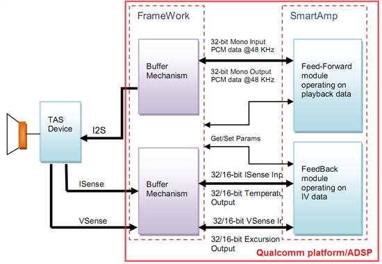 SmartPA主要是通過(guò)智能的保護(hù)算法實(shí)現(xiàn)對(duì)喇叭振幅和喇叭溫度的保護(hù),從而充分發(fā)揮喇叭的潛力,在有限的喇叭空間的情況下實(shí)現(xiàn)大音量和好音質(zhì)。這一部分TI的解決方案主要包括TAS2557, TAS2560和TAS2559。對(duì)于單聲道方案而言,主要是內(nèi)置DSP的TAS2557和不帶DSP的TAS2560。對(duì)于內(nèi)置DSP的方案而言,保護(hù)算法是跑在芯片內(nèi)部的DSP上,所以實(shí)現(xiàn)相對(duì)而言更容易。那對(duì)于沒(méi)有DSP的方案來(lái)說(shuō),保護(hù)算法是需要跑在平臺(tái)端的DSP上,那本文主要就是針對(duì)這種應(yīng)用,介紹下TAS2560如何在高通平臺(tái)上使用。
