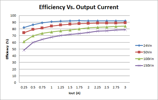 圖7所示為從原型電路板獲得的效率圖,圖中兩大參數(shù)為效率(%)和負載電流(A)。