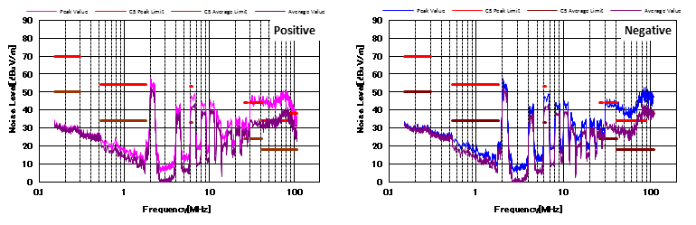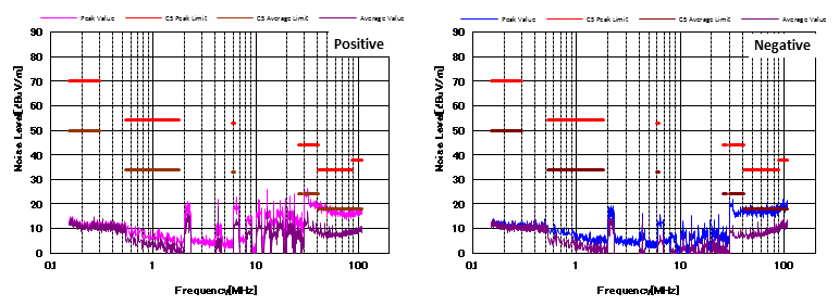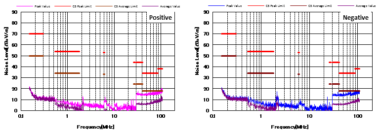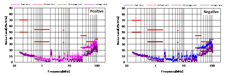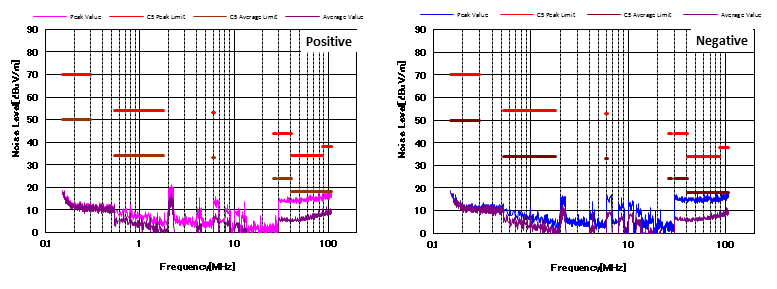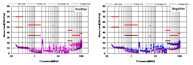 圖4顯示了增加CM和DM濾波器后的噪聲特性。 與圖3相比,CM濾波器的增加降低了近20dBμV/ m的CM噪聲。 并且EMI性能也通過(guò)了CISPR25 C5標(biāo)準(zhǔn)。