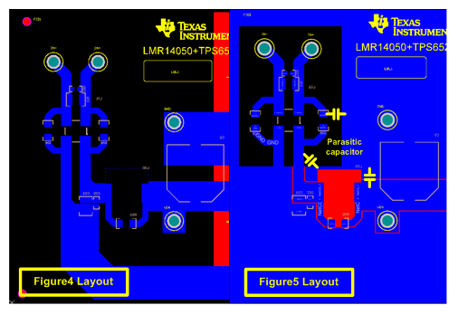 圖4和圖5之間噪聲結(jié)果的不同主要是由于PCB布線差異所致,如圖6所示。圖5的布線中(圖6的右側(cè)),大面積覆銅(GND)包圍著DM濾波器,并和Vin走線形成了一些寄生電容。 這些寄生電容為高頻信號(hào)旁路濾波器提供了有效的低阻抗路徑。 因此,為了最大限度地提高濾波器的性能,需要移除濾波器周圍所有的覆銅,如圖6左側(cè)的布線。