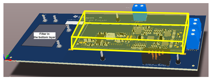 除了增加濾波器外,另一種優(yōu)化EMI性能的有效方法是增加屏蔽罩。 這是因?yàn)檫B接著GND的金屬屏蔽罩可以阻止噪聲向外輻射。 圖7推薦了一種屏蔽罩的擺放方法。該屏蔽罩恰好覆蓋了板上所有的元器件。