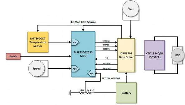 圖示1-基于TI產(chǎn)品的有刷式直流電機(jī)參考設(shè)計(jì)系統(tǒng)架構(gòu)圖