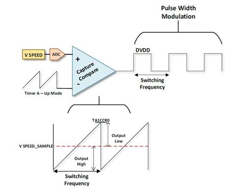 用于控制電機(jī)的PWM信號(hào)是使用MSP430G2553產(chǎn)生的。通過(guò)取樣速度電位器的滑動(dòng)電壓并將該樣本與Timer_A進(jìn)行比較MSP430的PWM信號(hào)具有不同的占空比和恒定的開(kāi)關(guān)頻率創(chuàng)建。