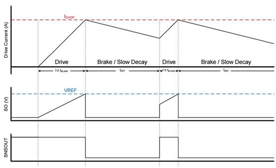 如果VSO大于或等于VREF,則SNSOUT引腳的輸出被拉低指示驅(qū)動(dòng)器故障,DRV8701正在切斷門信號(hào)。而VSO是小于VREF時(shí),SNSOUT引腳的輸出可通過(guò)外部上拉電阻拉高至邏輯高電平表示器件工作在典型的驅(qū)動(dòng)電流狀態(tài)。下面的圖顯示了電流斬波驅(qū)動(dòng)