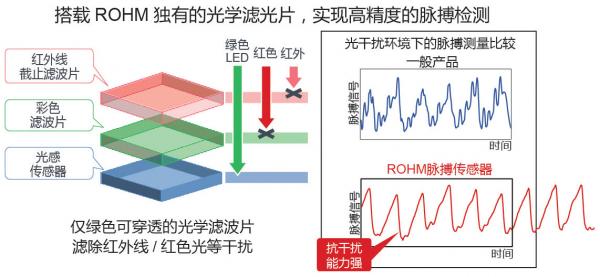 感光部由紅外截止濾光片和Green濾光片組成,采用僅綠色波長可穿透的ROHM獨有光學(xué)濾光片,成功將紅外線和紅外光等干擾的影響降低至一般產(chǎn)品的1/10以下。這使運動等劇烈變動和太陽光等紅外線較強環(huán)境下也可實現(xiàn)高精度的脈搏測量。