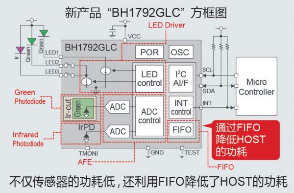 另外,與以往產(chǎn)品相比,新搭載了用來降低HOST(微控制器)端功耗的FIFO(First in First out)功能,通過降低脈搏傳感器和微控制器的功耗,助力應(yīng)用實現(xiàn)長時間驅(qū)動。