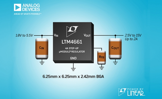 2018 年4月10日Analog Devices  (ADI) 宣布推出 Power by Linear™ LTM4661,該器件是一款采用 6.25mm x 6.25mm x 2.42mm BGA 封裝的低功率升壓型 µModule® 穩(wěn)壓器。只需少量的電容器和一個(gè)電阻器即可完成設(shè)計(jì),而且解決方案的占板面積小于 1cm² (單面 PCB) 或 0.5cm² (雙面 PCB)。LTM4661 內(nèi)置了一個(gè)開關(guān) DC/DC 控制器、MOSFET、電感器和支持組件。LTM4661 在 1.8V 至 5.5V 的輸入電源范圍內(nèi)工作,而且在啟動(dòng)之后可在低至 0.7V 的電壓條件下繼續(xù)運(yùn)行。輸出電壓可利用單個(gè)電阻器設(shè)定在 2.5V 至 15V 的范圍內(nèi)。該器件采用小巧扁薄的封裝并具有寬輸入和輸出電壓范圍,因而成為眾多應(yīng)用的理想選擇,包括光學(xué)模塊、電池供電型設(shè)備、基于電池的備份系統(tǒng)、用于功率放大器或激光二極管的偏置電壓以及小型 DC 電機(jī)。