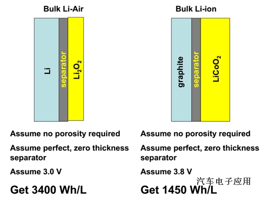 鋰空電池這樣大的極化對應(yīng)到的能量轉(zhuǎn)化效率實(shí)際上只有60~70%,這對于實(shí)際使用來說還是一個非常難以接受的數(shù)據(jù),對于動力電池方面尤其如此。另外,與很多納米相關(guān)的研究方向一樣,鋰空電池的研究成果對于體積比能量(Wh/L)的報道也很少,而這一參數(shù)對于動力電池領(lǐng)域也是一個至關(guān)重要的參數(shù)。在此再次援引JEFF DAHN教授的報告中的內(nèi)容,其指出鋰空電池的理論體積比能量是3400Wh/L(大約是鋰離子電池的三倍),因此在這方面雖然有優(yōu)勢,但是并不如想像那么大。而如果考慮到鋰負(fù)極應(yīng)用時需要的鋰過量,可能優(yōu)勢就更小了。因此鋰空技術(shù)的實(shí)用化,也需要鋰金屬電極技術(shù)的進(jìn)步。