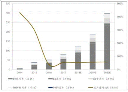 隨著國際石油價格上揚及各國對于環(huán)保問題的逐漸重視,新能源汽車逐漸成為世界汽車產(chǎn)業(yè)的發(fā)展趨勢。政策傾斜力度增加、大型車企搶灘布局、消費者環(huán)保意識的不斷增強,導(dǎo)致了我國新能源汽車市場迅速擴張。2009年密集扶持政策打開了我國新能源汽車增長的快車道,2011年行業(yè)進(jìn)入產(chǎn)業(yè)化階段,2014年我國電動車市場更是呈現(xiàn)出井噴態(tài)勢,產(chǎn)銷量均同比大漲三倍以上。近年來更是產(chǎn)銷兩旺,2017年全年新能源汽車?yán)塾嬌a(chǎn)79.4萬輛,銷售77.2萬輛,比上年同期分別增長53.8%和53.3%,2014-2017產(chǎn)量復(fù)合增長率達(dá)104%。國家“十三五”規(guī)劃提出,截止2020年新能源汽車銷量將達(dá)200萬輛;近日中央四部委聯(lián)合發(fā)布電動車免購置稅政策延續(xù)至2020年,政策的傾斜更加佐證電動車是未來發(fā)展主流。預(yù)計2018年新能源汽車銷量能夠突破100萬臺。國內(nèi)新能源汽車產(chǎn)銷量屢創(chuàng)新高帶來動力鋰電池行業(yè)爆發(fā)式增長。