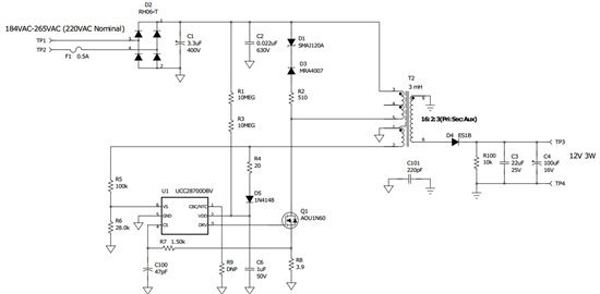 由于采用一次側(cè)穩(wěn)壓 (PSR) 技術(shù),因此光耦合器和補(bǔ)償電路可從反激式偏置電源中移除,同時還可保持 5% 的輸出穩(wěn)壓。