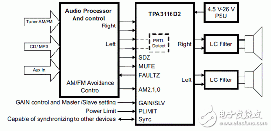 The TPA3116D2 is a 50-W (per channel), efficient, stereo, digital-amplifier power stage for driving two bridge-tied speakers or a single parallel bridge-tied load. The TPA3116D2 can drive a speaker with an impedance as low as 3.2 Ω (4 Ω typical)。