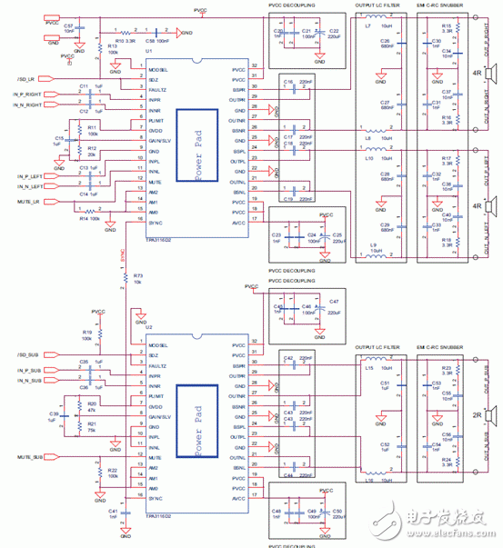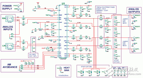 | TI公司的TPA31xxD2系列是立體聲高效數(shù)字功率放大器,能驅動2歐姆揚聲器高達100W.工作電壓4.5 V – 26 V,效率大于90%,TPA3130D2的高效率可采用單層PCB,不用散熱器提供2x15W輸出功率, TPA3118D2采用雙層PCB, 不用散熱器提供2x30W/8歐姆輸出功率, TPA3116D2采用小型散熱器可提供2x50W/4Ω輸出功率,主要用于小/微型元件的條形音箱,后市場汽車電子,CRT TV和消費類音頻。本文介紹了TPA31xxD2主要特性,方框圖, 應用電路圖以及評估板TPA3116D2EVM主要指標,電路圖,材料清單和PCB布局圖。