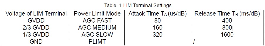 通過設(shè)置LIM引腳從GVDD的分壓值,HT317可進(jìn)入不同的自動增益控制模式或限幅功能,如下表所示。