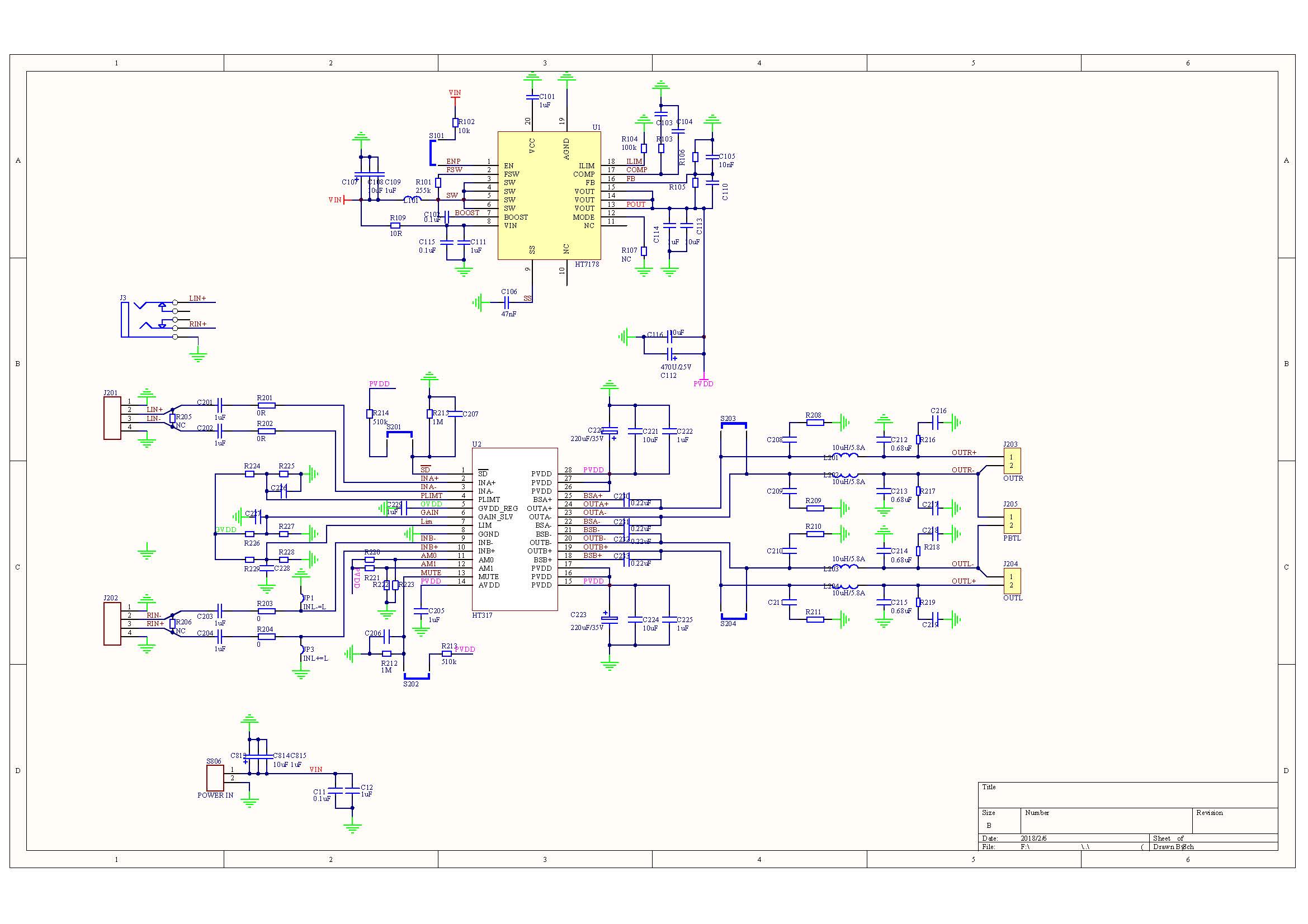 2,采用HT317 D類(lèi)音頻功放IC,20V提供52W/4歐 ( THD+N=10%)持續(xù)功率輸出;