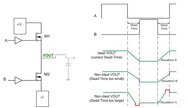 D類放大器死區(qū)時(shí)間(即兩個(gè)開(kāi)關(guān)均處于關(guān)閉狀態(tài)時(shí)的時(shí)間段)直接影響到效率和THD。過(guò)于短暫的死區(qū)時(shí)間會(huì)引起直通電流,降低效率,過(guò)長(zhǎng)的死區(qū)時(shí)間又會(huì)增大THD,這會(huì)給音頻保真度帶來(lái)不利影響。