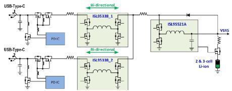 圖1顯示了一種新的USB-C架構(gòu),該架構(gòu)由ISL95338雙向降壓-升壓穩(wěn)壓器和ISL95521A組合式電池充電器或ISL9238降壓-升壓電池充電器組成。這種新架構(gòu)允許系統(tǒng)通過USB-C端口給電池充電,當(dāng)兩個(gè)PD充電器插入U(xiǎn)SB-C_1和USB-C_2時(shí),還支持快速充電功能。無需額外復(fù)雜的端口控制邏輯電路或IC,該架構(gòu)的兩個(gè)端口就可全面支持USB 3.1 On-The-Go(OTG)。