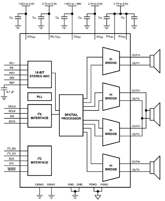 TI(NS) 公司的LM48901是四路音頻D類功率放大器,輸出級采用前沿速率恐怖行動(ERC)PWM架構(gòu),能降低RF輻射而維持音頻質(zhì)量和效率,它的I2S接口和標(biāo)準(zhǔn)串行音頻接口兼容,差分輸入立體聲ADC,平行輸出模式,RL = 8歐, THD+N ≤10%時的輸出功率為1.7W ,RL = 4?, THD+N ≤10%時為2.8W (typ),而典型的THD+N為0.06%,主要用在便攜式計算機,平板電腦,臺式電腦,條形音箱,多媒體設(shè)備,MP3播放器附件和塢站.本文介紹了LM48901主要特性和指標(biāo),音頻放大器應(yīng)用電路,通路音頻放大器應(yīng)用電路和I2C_EN/I2C_EX菊花鏈案例應(yīng)用電路以及評估板主要特性.