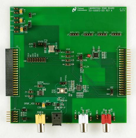 The LM49801 evaluation board accepts three audio input formats: stereo differential analog, SPDIF, or I2S. Multiple boards are easily cascaded, increasing the number of channels. The LM48901 can also be configured as a 2.1 amplifier for stereo + subwoofer applications.