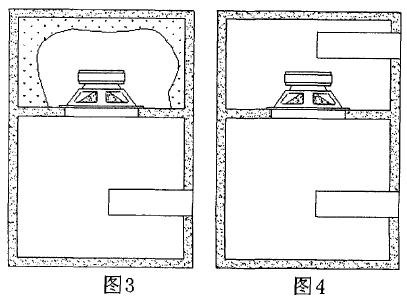 這種音箱比較少見,參見圖3、圖4,由圖可以看出,它是在閉箱與倒相式音箱的基礎(chǔ)上發(fā)展而來的。既有閉箱的設(shè)計痕跡,也有倒相式音箱的特征,其中圖3所示音箱也有稱四階帶通式音箱,圖4所示音箱可以稱之為六階帶通式音箱。