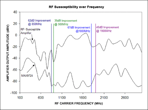 圖2. 數(shù)據(jù)表明:與普通放大器相比,MAX9724有效降低了放大器的RF敏感度