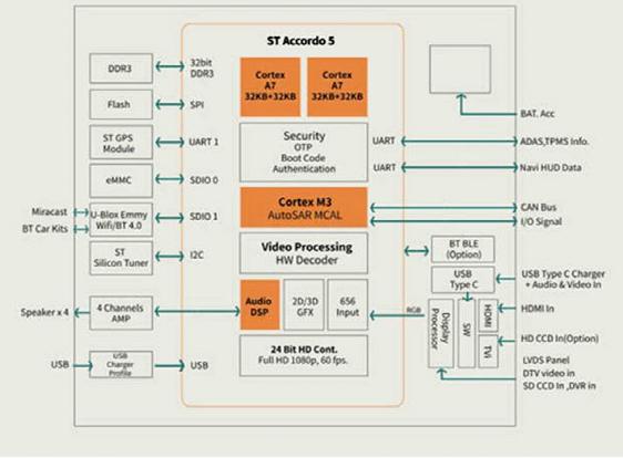 ST的Accordo 5(以下簡(jiǎn)稱(chēng)AC5)汽車(chē)處理器可實(shí)現(xiàn)駕駛者十分看重的實(shí)用功能,例如智能手機(jī)投屏可以讓駕駛者在車(chē)載顯示屏幕上安全查看或使用手機(jī)上的內(nèi)容,或音樂(lè)和導(dǎo)航服務(wù)。先進(jìn)的主處理器和高性能圖形及音視頻引擎可以實(shí)現(xiàn)復(fù)雜的資訊顯示功能,例如同時(shí)顯示使用者界面、倒車(chē)影像、導(dǎo)航地圖、視頻預(yù)覽。播放功能支持H.264和DivX®等主要視頻編碼格式,以及涉及圖形混合覆蓋等圖效處理的2D和3D圖形。新產(chǎn)品提供USB界面和SD存儲(chǔ)卡界面。