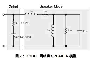 實(shí)際喇叭的高頻阻抗因?yàn)榫圈電感而呈現(xiàn)隨頻率增高而上升的趨勢(shì),由此導(dǎo)致了LC濾波網(wǎng)絡(luò)的高Q值。ZOBEL是和喇叭并聯(lián)的阻容網(wǎng)絡(luò),它可以用來(lái)補(bǔ)償喇叭的感性而抑制喇叭阻抗的抬升。如圖7所示,ZOBEL網(wǎng)絡(luò)有電阻和電容組成。計(jì)算公式為(參見引用3):